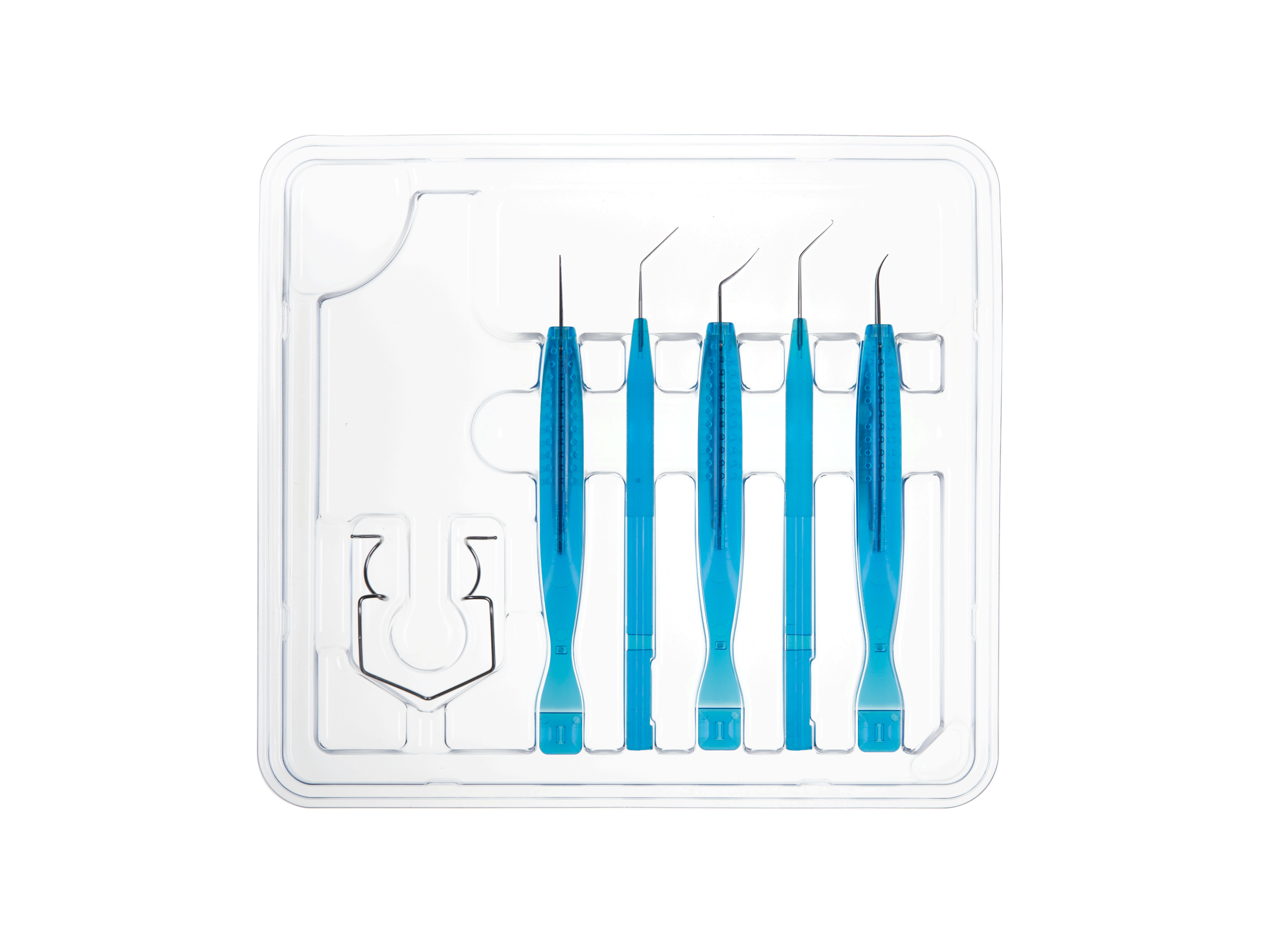 Sterilisierte Einmalinstrumente für die Kataraktchirurgie in einem Tray. Für die einfache und schnelle OP-Vorbereitung. Hergestellt in Frankreich.