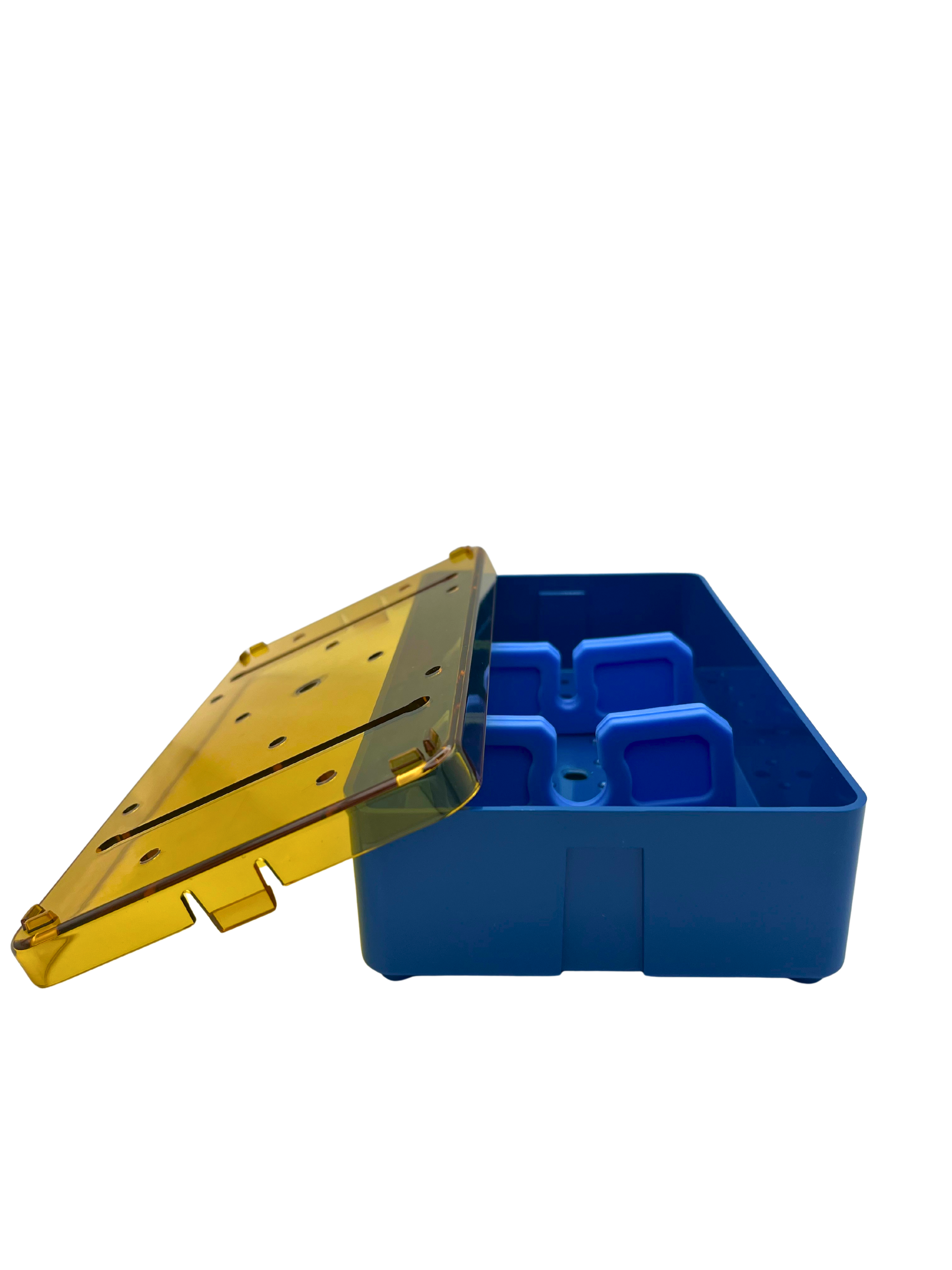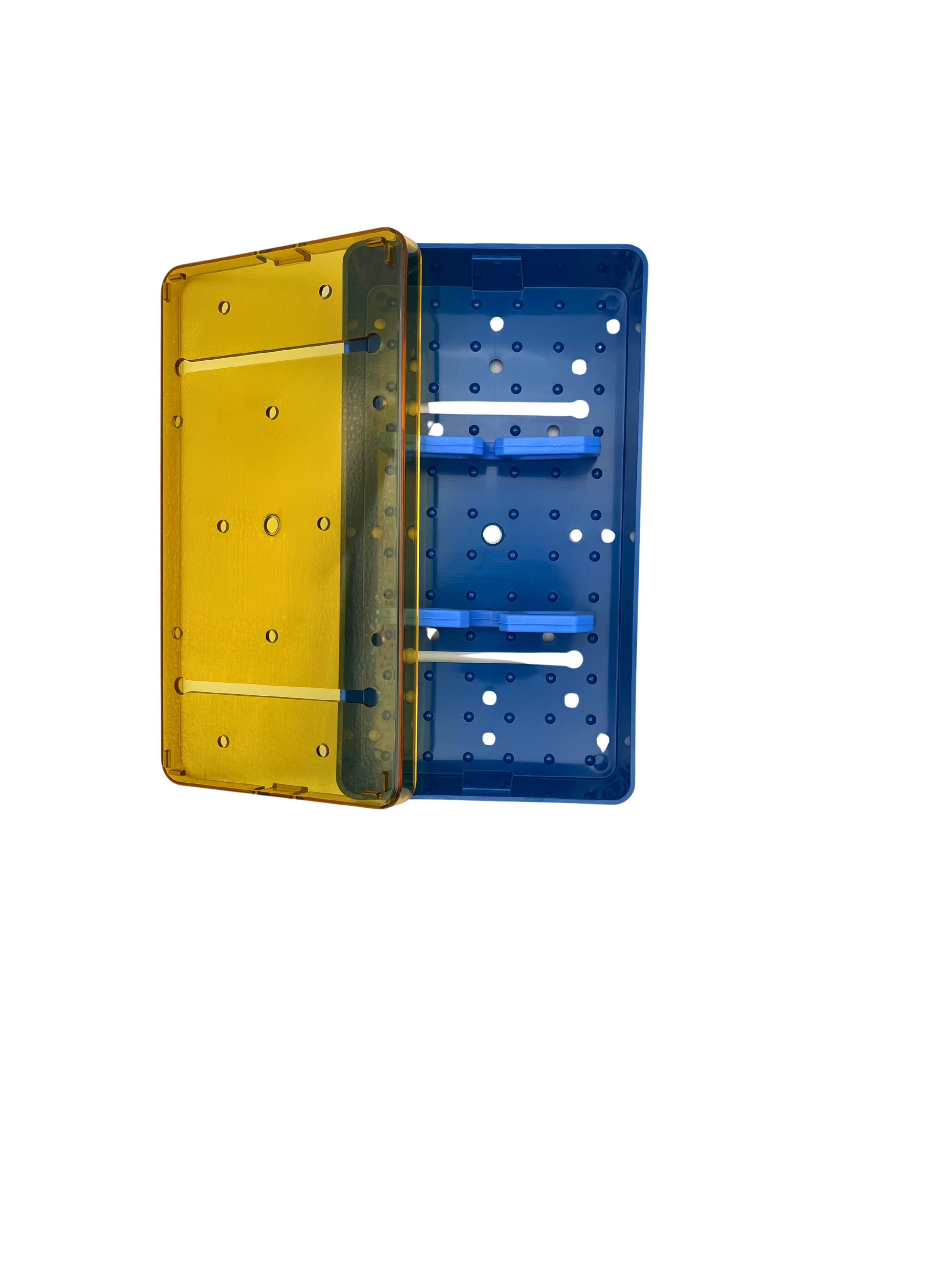 Die SteriBest Instrumentenschale mit Basis und Deckel sowie 2 Einsätzen für die Phakohalterung (8mm und 16mm Einkerbung) und den Maßen 190,5 x 102 x 38 mm. bietet eine moderne Lösung für eine zuverlässige und schonende Aufbereitung empfindlicher Instrumente. Silikonhalterungen und Stiftmatten stabilisieren empfindliche Instrumente und fördern einen optimalen Kontakt mit dem Sterilisationsmedium. Die Schale ist stapelbar und erleichtert eine effiziente Organisation im Alltag.