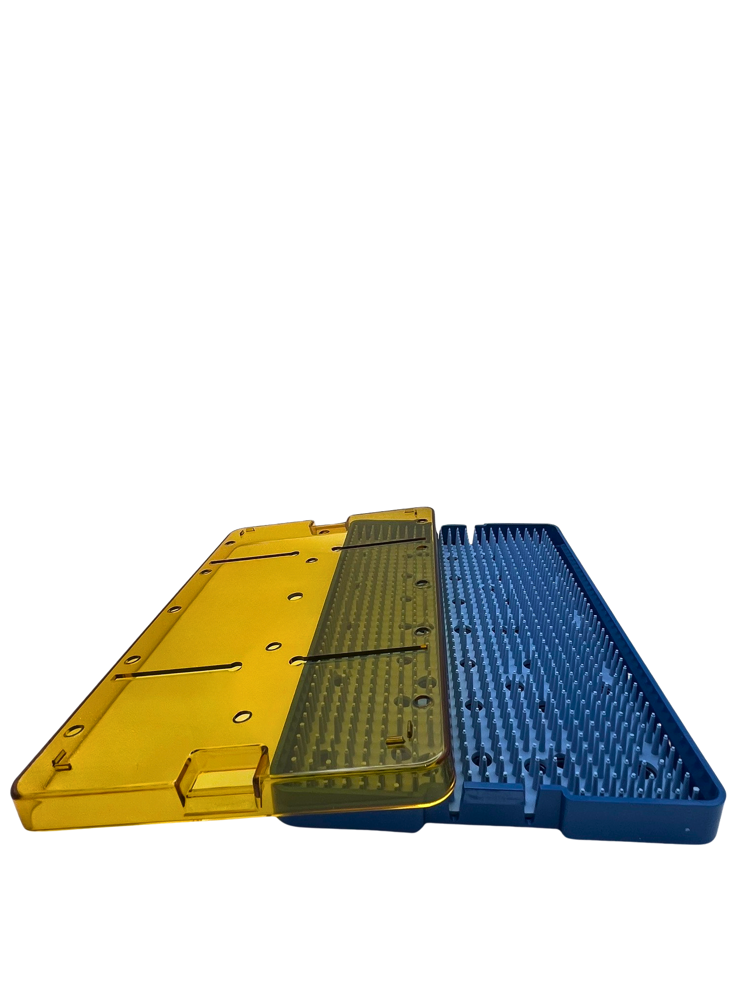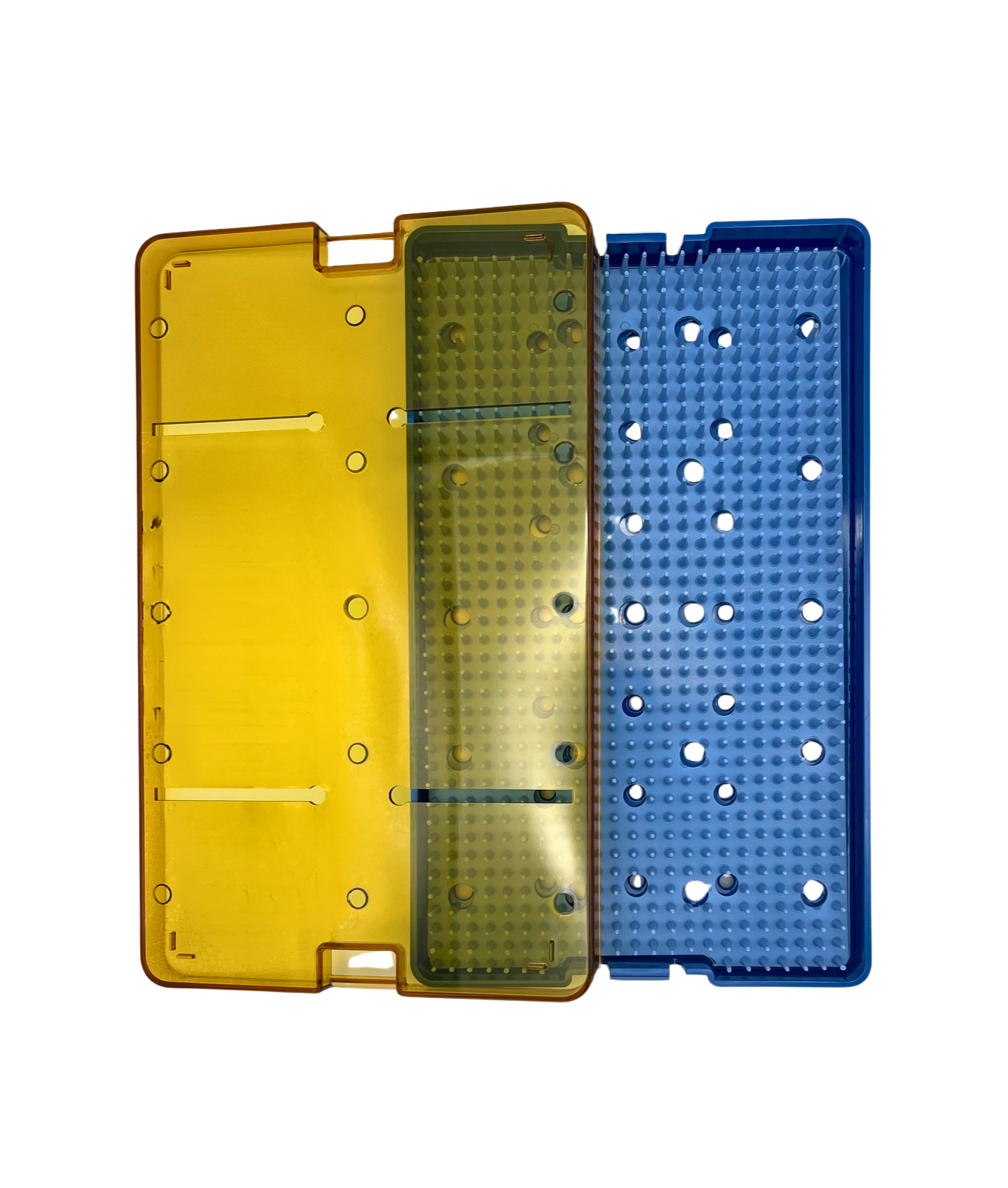 Die SteriBest Instrumentenschale mit Basis, Deckel Silikonmatte und Matteneinlage und den Maßen 254 x 152 x 19 mm. bietet eine moderne Lösung für eine zuverlässige und schonende Aufbereitung empfindlicher Instrumente. Silikonhalterungen und Stiftmatten stabilisieren empfindliche Instrumente und fördern einen optimalen Kontakt mit dem Sterilisationsmedium. Die Schale ist stapelbar und erleichtert eine effiziente Organisation im Alltag.