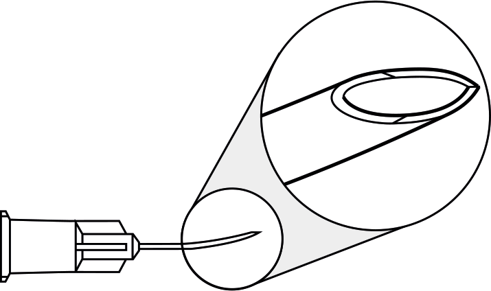 Entwickelt von Dr. Stanley Rous, Fort Lauderdale, FL. Bei der sanft gebogenen Nadel befindet sich die Abschrägung auf der Innenseite der Biegung. Dies ermöglicht eine sichere Injektion von Anästhetika, Steroiden oder Antibiotika unter direkter Sicht. Die sanft gekrümmte und nach unten abgeschrägte Konfiguration reduziert erheblich das Risiko potenzieller Nadelkomplikationen im Vergleich zu langen retrobulbären oder peribulbären Nadeln, die einen blinden Durchgang erfordern und der Krümmung des Augapfels nicht folgen können.